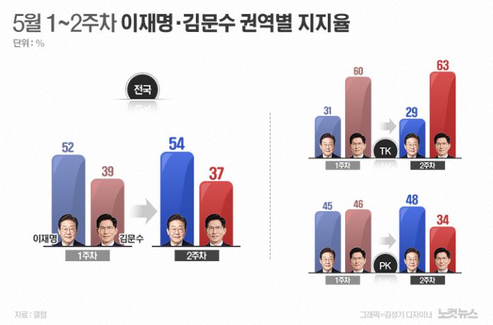 갤럽 조사에서 TK 지지율은 5월 1주차 김 후보 60%, 이 후보 31%에서 2주차 김 후보 63%, 이 후보 29%로 나타났다. PK에서는 1주차 김 후보 46%, 이 후보 45%이던 것이 2주차에는 이 후보 48%, 김 후보 34%로 이 후보가 역전했다.