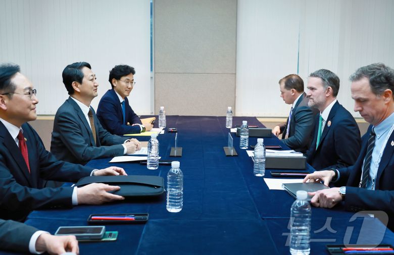 안덕근 산업통상자원부 장관이 16일 오후 제주 서귀포시 제주국제컨벤션센터(ICC)에서 제이미슨 그리어(Jamieson Greer) 미국 무역대표부(USTR) 대표와 면담을 갖고 있다. (산업통상자원부 제공. 재판매 및 DB 금지) 2025.5.16/뉴스1 |