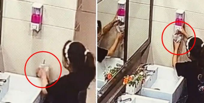 중국의 한 여학생이 다른 사람의 음료에 몰래 손 세정제를 짜 넣는 모습의 CCTV 영상이 공개돼 논란이다.