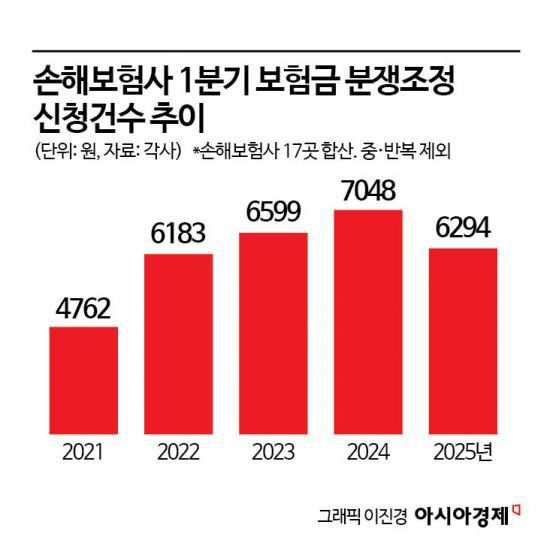 20일 보험업계에 따르면 올해 1분기 손보사 17곳의 분쟁조정 신청 건수는 6294건(중·반복 제외)으로 전년 동기 대비 10.7% 감소했다. 1분기 기준 분쟁조정 신청 건수는 2021년 4762건, 2022년 6183건, 2023년 6599건, 2024년 7048건으로 3년 연속 증가하다 올해 감소로 전환했다. 분쟁조정은 고객이 보험사와 분쟁이 생겼을 때 금융위원회나 한국소비자원을 통해 보험금 지급 여부 등을 따져보는 절차다.
