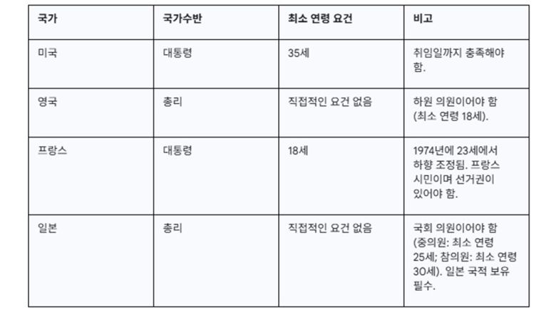 다른 국가들은 대선 출마 연령 제한이 우리나라보다는 낮은 편입니다.
