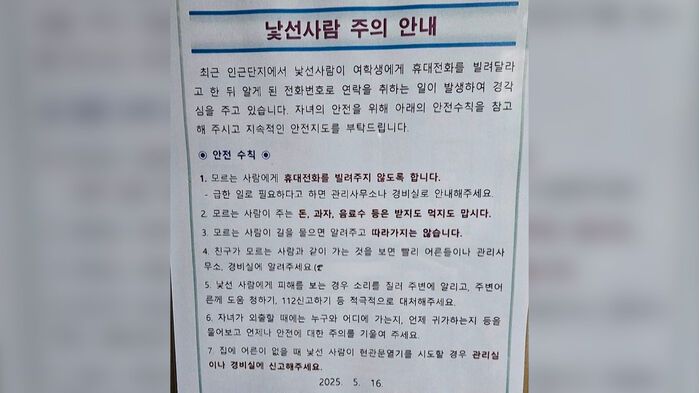 아파트 측은 낯선 사람이 여학생에게만 휴대전화를 빌려서 전화번호를 파악한 뒤 연락을 하는 일이 있었다며 각별한 주의를 당부했습니다.