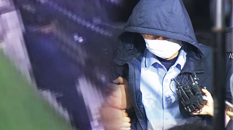 남색 후드 점퍼에 달린 모자를 뒤집어쓰고 마스크를 쓴 남성이 경찰 호송 차량에서 내립니다.