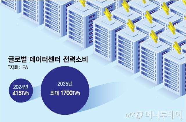 19일 관련 업계에 따르면 IEA(국제에너지기구)는 2035년 글로벌 데이터센터의 전력소비가 최대 1700TWh(테라와트시)에 달할 수 있다고 예측했다. 지난해(415TWh)에 비해 4배 이상 증가한 수치다. 2024~2035년 전세계 데이터센터 전력수요 증가율의 경우 연평균 9.9% 수준을 기록할 것으로 집계됐다.