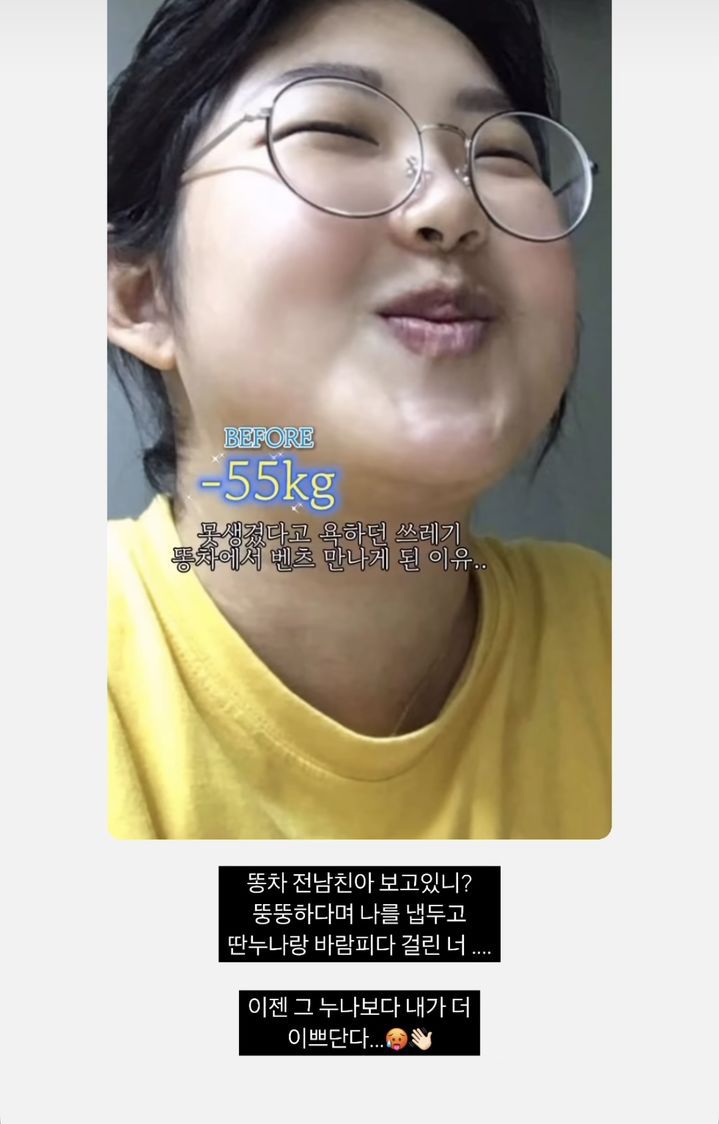 "몇 달 전 제 다이어트 비포 애프터 릴스에 그 똥차놈이 댓글을 달더라. 자기 친구를 언급하며, 무슨 말을 하고 싶었을까"라고 전 남친을 겨냥했다.