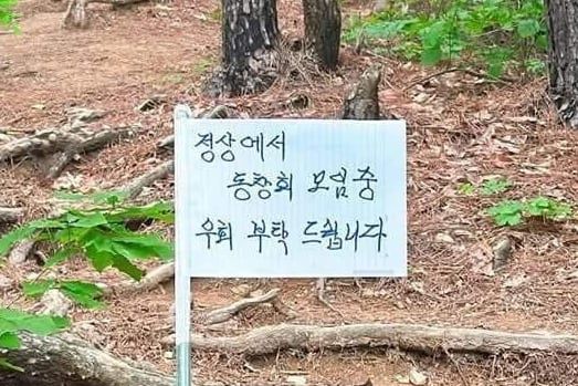 17일 네티즌 A씨는 소셜미디어에 경기도 포천의 한 호수공원에서 찍은 사진을 올렸다. 등산로 입구로 보이는 곳에 “정상에서 동창회 모임 중. 우회 부탁 드립니다”라고 적힌 팻말이 꽂힌 모습이었다.