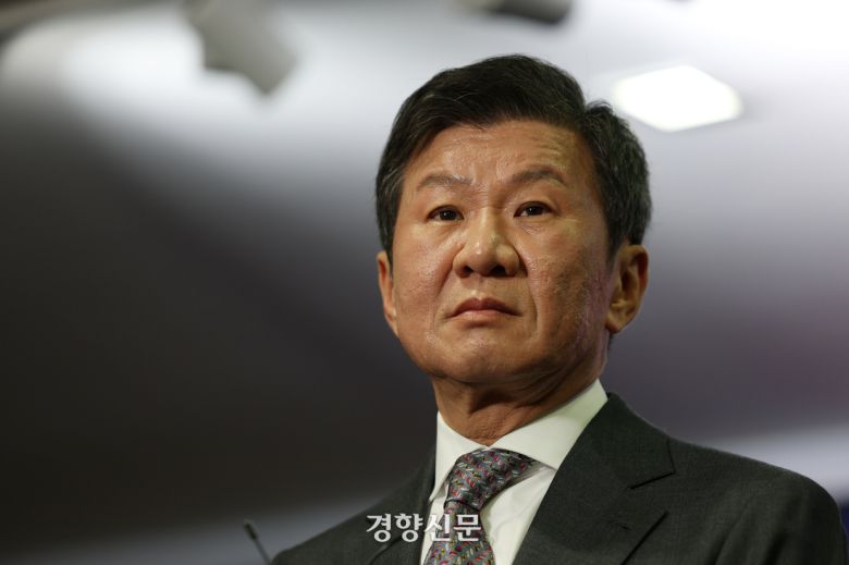 정몽규 회장이 지난 2월26일 서울 종로구 축구회관에서 열린 제55대 대한축구협회 회장 선거에서 당선이 확정된 뒤 기자들의 질문을 듣고 있다. 권도현 기자