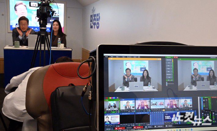 제21대 대통령선거 재외국민투표가 시작된 20일 오전 이재명더불어민주당 대선후보가 경기 의정부시 유세를 앞두고 버스에서 재외국민투표독려를 위한 'K-이니셔TV'로 전세계 재외동포를 연결한 줌방송을하고 있다.