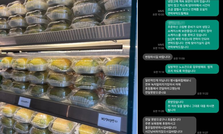 지난 3월 제주에서 군 간부를 사칭해 예약 주문한 빵과 조롱 메시지. 피해자 제공 |