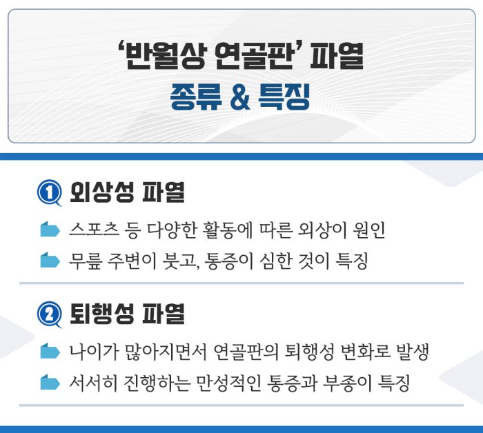 반월상 연골판 파열의 원인에 따른 종류는 레포츠를 즐기는 젊은 사람들에게 많은 '외상성 파열’과 나이가 들면서 발생하는 '퇴행성 파열’이 있습니다.