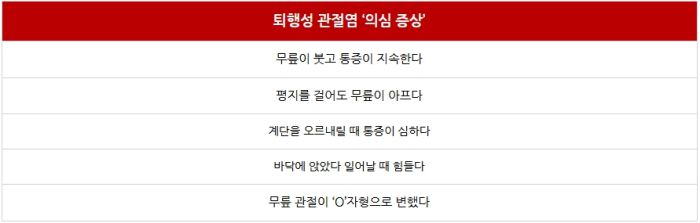 퇴행성 관절염이 찾아오면 염증 때문에 무릎이 붓고, 평지를 걸을 때도 통증을 느낍니다. 통증은 계단을 오르내릴 때 더 심합니다. 바닥에 앉아 있다가 일어날 때도 힘듭니다. 연골이 많이 닳아서 병이 어느 정도 진행되면 다리 관절이 변형돼서 'O’자형 다리가 되기도 합니다.