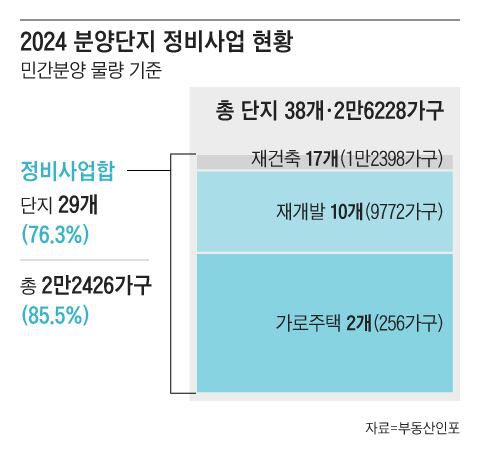 20일 부동산인포에 따르면 지난해 공급된 서울 38개 단지 중 29개 단지가 정비 사업을 통해 공급된 것으로 나타났다. 단지 수 기준으로는 전체의 76.3%에 달한다. 지난해 공급된 2만6228가구 중 재건축 1만2398가구, 재개발 9772가구, 가로주택 256가구가 정비 사업 물량으로 전체 85.5%를 차지했다.