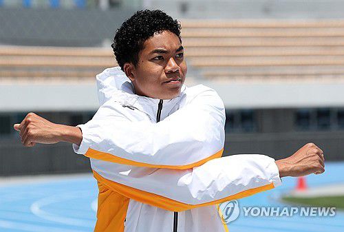 (구미=연합뉴스) 김현태 기자 = 20일 한국 육상의 단거리 유망주 나마디 조엘진(예천군청)이 2025 구미 아시아육상경기선수권대회가 치러질 구미시민운동장을 찾아 스트레칭을 하고 있다. 2025.5.20 mtkht@yna.co.kr