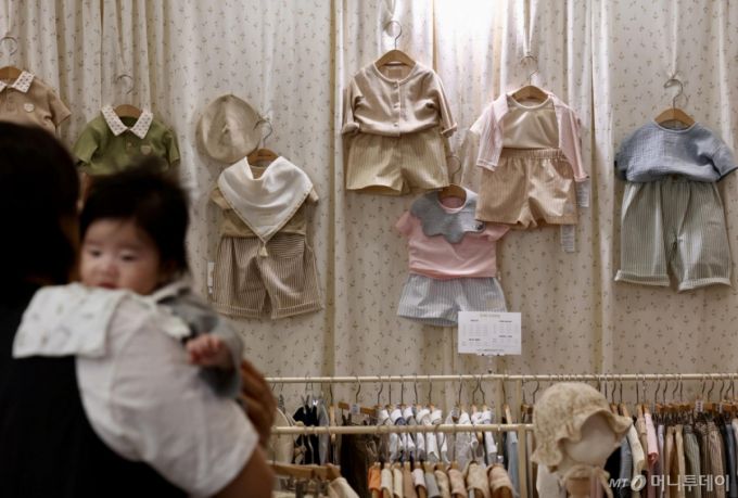 지난 8일 오전 경기 고양시 킨텍스에서 열린 코베 베이비페어&유아교육전에 아기옷이 진열돼 있다/사진=뉴시스 /사진=