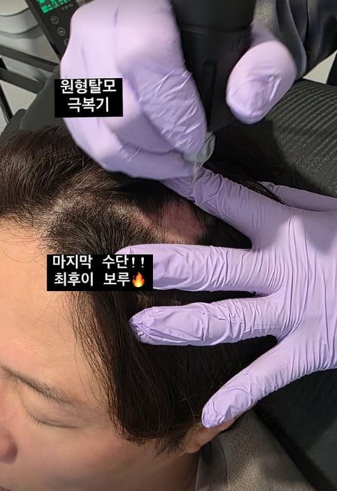 박성광은 20일 자신의 인스타그램 스토리에 "원형탈모 극복기. 마지막 수단!! 최후의 보루"라는 문구와 함께 한 장의 사진을 게재했다.
