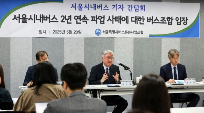 김정환 서울시버스사업조합 이사장(가운데)이 20일 서울 중구 상연재 별관에서 열린 서울시내버스 2년 연속 파업 사태에 대한 대응책 세부안 발표 기자회견에 참석해 발언하고 있다./사진=뉴스1