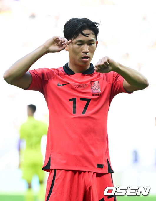 [OSEN=알 와크라(카타르), 지형준 기자] 25일(현지시간) 오후 카타르 알 와크라에 위치한 알 자누브 스타디움에서 2023 아시아축구연맹(AFC) 아시안컵 E조 조별리그 최종전 대한민국과 말레이시아의 경기가 열렸다.전반 정우영이 선제골 넣고 세리머니를 하고 있다. 2024.01.25 / jpnews.osen.co.kr |