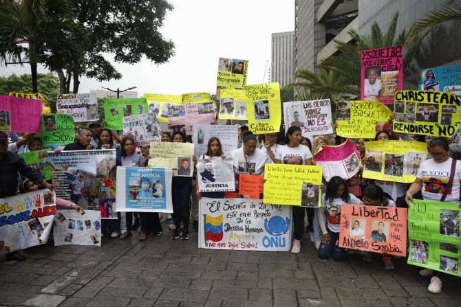 미국에서 엘살바도르의 대형 교도소로 추방된 베네수엘라 이민자들의 친척들이 4월 22일(현지시간) 카라카스에서 그들의 자유를 요구하는 시위를 벌이고 있다. (사진=AFP) |