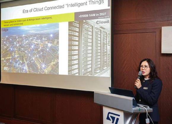 최경화 ST마이크로일렉트로닉스 이사가 20일 서울 서초구 노보텔 앰버서더 강남 호텔에서 열린 신제품 발표 기자간담회에서 인사말을 하고 있다. [사진=ST마이크로일렉트로닉스] |