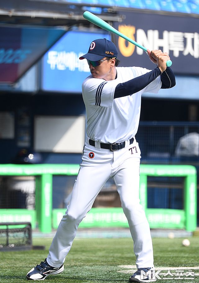 두산 이승엽 감독이 타격 자세를 취하고 있다.