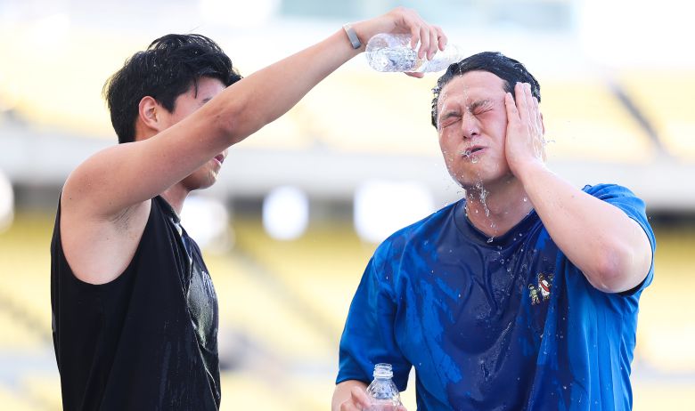 대구 낮 최고기온이 33.4도까지 오른 20일 대구스타디움에서 열린 대구시 재난안전기동대 채용 체력 검정을 마친 한 응시자가 시원한 물로 세수하고 있다. /연합뉴스
