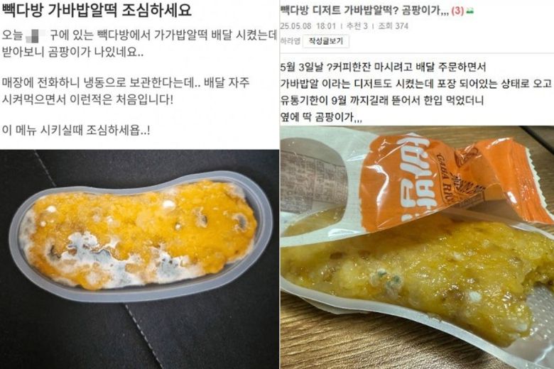 작성자 B씨는 또 다른 커뮤니티에 지난 8일 “5월 3일 커피 한잔 마시려고 배달 주문하면서 가바밥알떡이라는 디저트도 시켰다”며 “포장된 상태로 오고 유통기한이 9월까지길래 한입 먹었더니 옆에 딱 곰팡이가”라며 사진을 공개했다. 사진 속 디저트 제품에는 곰팡이로 추정되는 이물질이 표면에 드러나 있었다.