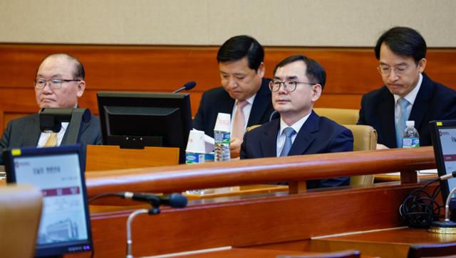 서울시 공무원 간첩조작 사건 피해자 유우성 씨를 보복 기소했다는 이유로 탄핵소추됐던 안동완(앞줄 오른쪽) 부산지검 2차장검사가 지난해 2월 20일 서울 종로구 헌법재판소에서 열린 첫 변론기일에 자리하고 있다. 뉴스1