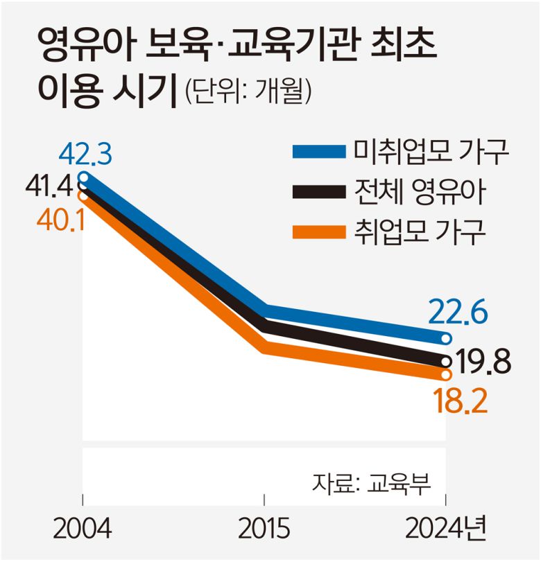 실제 엄마가 미취업 상태인 영유아의 최초 기관 이용 시기도 2004년 42.3개월에서 2024년 22.6개월로 20개월가량 당겨져 맞벌이 여부를 떠나 전반적으로 기관 이용 시기가 빨라지고 있는 것으로 나타났다.