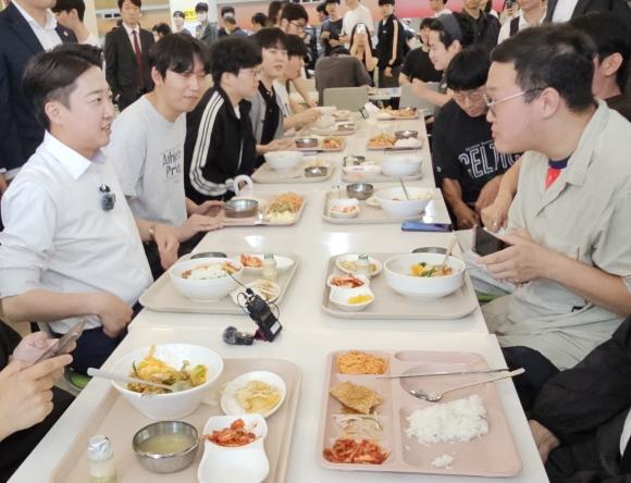 전남대 학생들과 ‘학식 소통’ - 이준석(맨 왼쪽) 개혁신당 대선 후보가 20일 광주 북구 전남대 학생식당에서 학생들과 식사하며 대화를 나누고 있다. 광주 뉴스1 |