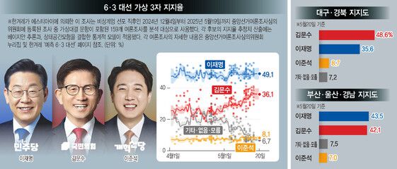 김문수 국민의힘 대통령 후보의 지지율이 35%를 돌파했다. 일주일 전에 견줘 상승세가 뚜렷하다. 김 후보 지지율에 잡히지 않았던 ‘샤이 보수’가 결집한 결과로 보인다. 이재명 더불어민주당 후보는 취약지인 부산·울산·경남에서 김문수 후보를 앞서는 등 선전하고 있지만, 시간이 갈수록 격차가 좁혀지는 흐름이다. 이 후보는 역대 민주당 계열 후보 중 처음으로 부산·울산·경남 지역에서 1위를 할 수 있을까?