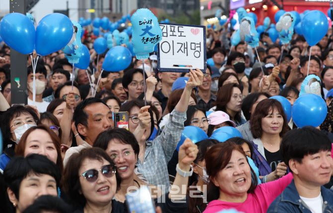 [이데일리 노진환 기자] 20일 오후 경기 김포시 구래동 구래역 문화의 거리에서 시민들이 이재명 더불어민주당 대선 후보의 연설에 지지를 보내고 있다. 이 기사의 카테고리는 언론사의 분류를 따릅니다.0공유하기