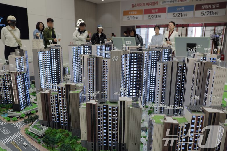 11일 서울 은평구 대조동 힐스테이트 메디알레 견본주택을 찾은 시민들이 단지배치 모형을 살펴보고 있다. 2025.5.11/뉴스1 ⓒ News1 박정호 기자 |