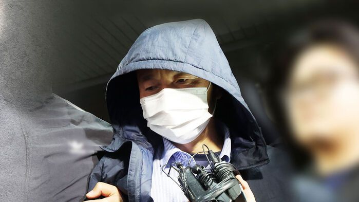 모자와 마스크로 얼굴을 가린 남성이 호송차량에서 내립니다.