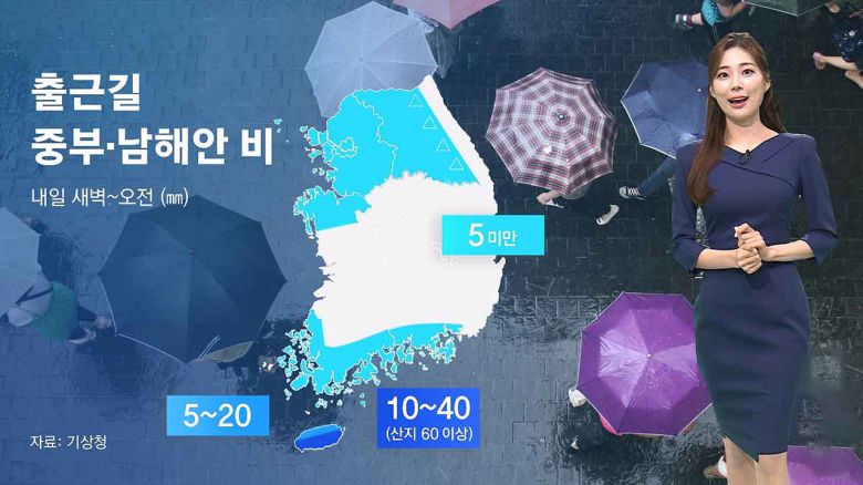 출근길에는 우산을 챙기시는 게 좋겠습니다. 새벽부터 오전 사이 중부와 남해안을 중심으로 비가 조금 지나겠습니다. 낮 동안에도 경기 동부와 강원, 충청 이남 내륙 지역을 중심으로 소나기 소식이 있겠는데요. 천둥, 번개를 동반해 5~40mm 정도 내리겠습니다.
