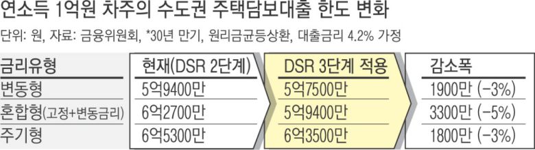 7월1일부터 수도권에서 가계대출 한도를 조이는 스트레스 총부채원리금상환비율(DSR) 3단계 규제가 시행된다. 연 소득 1억원인 직장인의 주택담보대출 한도는 최대 3300만원 줄어들 것으로 예상된다. 다만 수도권을 제외한 지역은 주택경기 침체를 우려해 올 12월까지 시행을 유예한다. 대출 규제 강화로 향후 금리 인하기에 가계대출 증가 속도를 제어할 수 있을지 주목된다.