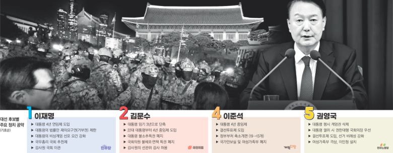 다만 국회의 권한 조정이나 감사원 등 주요 정부 기관의 개편을 두고는 방향성이 극명하게 엇갈렸다. 이재명 더불어민주당 대선 후보는 국무총리 국회 추천, 국회 임명동의 고위공직자 범위 확대, 감사원 국회 이관 등 국회 권한 강화 방안을 제시했다. 반면 김문수 국민의힘 대선 후보는 국회의원 불체포·면책 특권 폐지와 감사원의 선관위 감사 허용 등을 내세웠다.