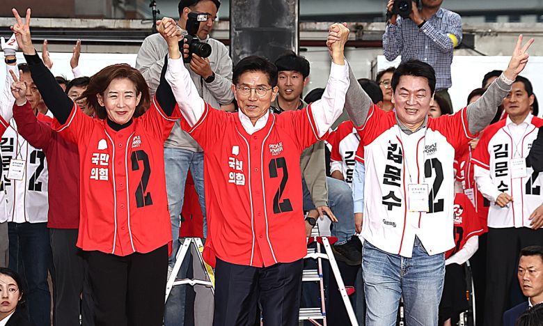 김문수 국민의힘 대통령 후보가 19일 서울 중구 서울역 광장에서 나경원, 안철수 의원의 손을 잡고 유세를 하고 있다.뉴스1 |