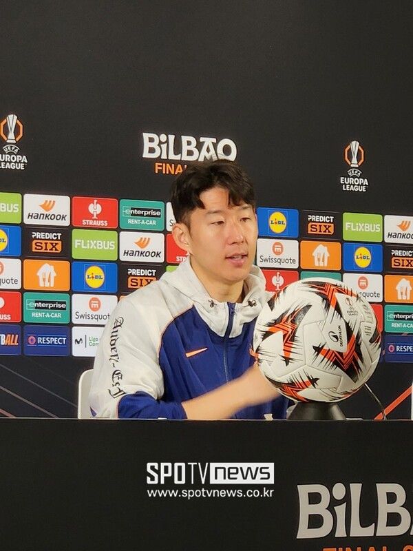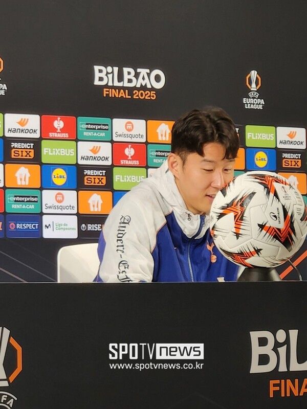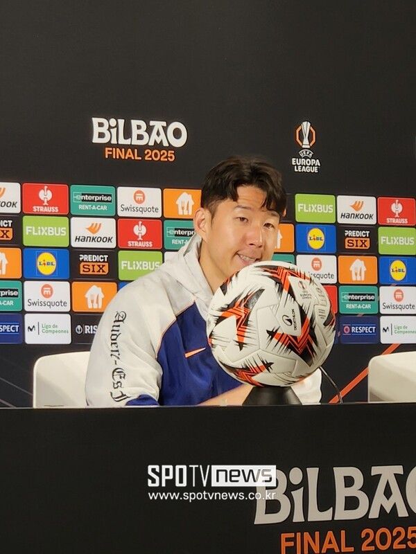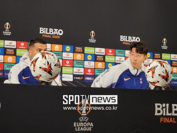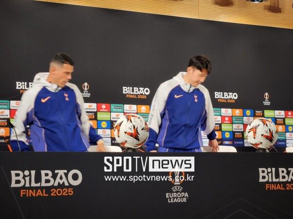 손흥민은 페드로 포로와 함께 20일 오후(한국시간) 스페인 빌바오의 에스타디오 산 마메스에서 열린 2024-25 유럽축구연맹 유로파리그(UEL) 맨체스터 유나이티드와의 결승전 사전 공식 기자 회견에 참석했다.