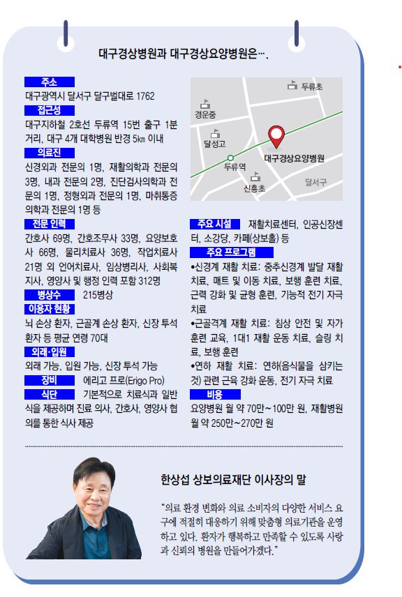 상보의료재단은 산하에 대구경상병원과 대구경상요양병원을 운영하고 있다. 한 건물에서 요양, 전문 재활, 투석 등이 전부 가능하다. 특히 대구경상병원은 보건복지부가 지정한 회복기 재활의료기관으로 일반 급성기 의료기관에서 수술 등 치료를 받은 환자에게 맞춤형 재활 치료를 제공한다. 환자가 ‘골든타임’을 놓치지 않고 장애 없이 노후를 이어 나갈 수 있도록 지원하는 게 핵심이다.