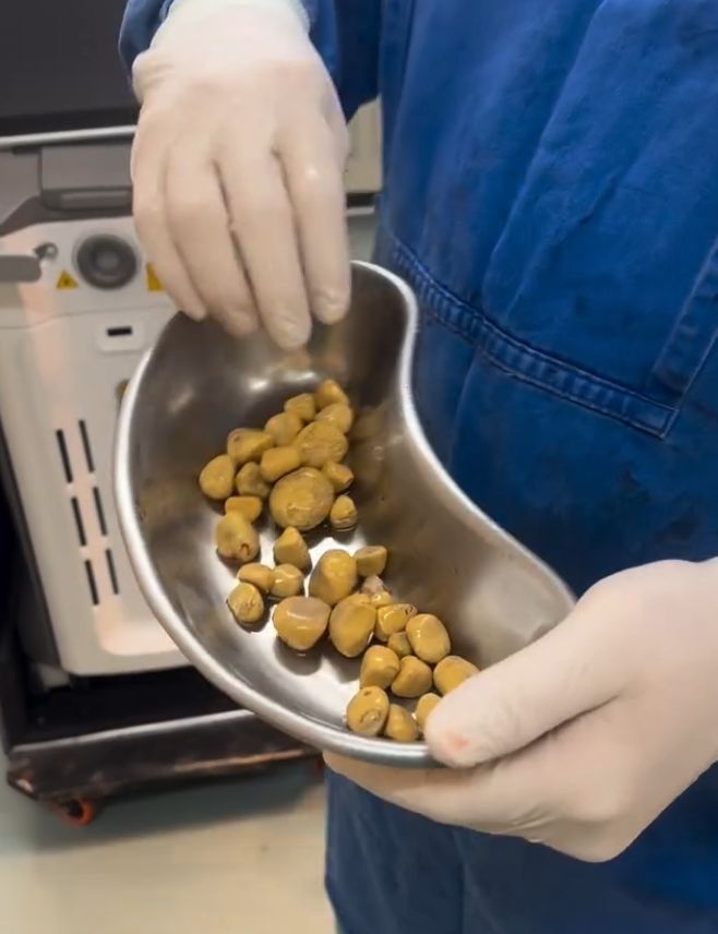 의료진은 초음파 검사를 통해 방광결석을 확인, 약 2시간에 걸친 개복 방광 절개술로 총 600g의 결석 35개를 제거했다.