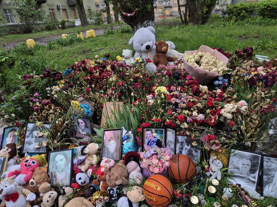 차량이 덜컹거리며 골목길로 들어갔다. 4~5층 규모의 낡은 아파트가 다닥다닥 붙은 주거 밀집 지역이었다. 동유럽에서 인기 있는 스코다 소형차들이 입구에 주차된 게 눈에 들어왔다. 5분가량 아파트촌 안쪽으로 들어가자 꽃다발 더미와 인형에 뒤덮인 화단이 나왔다. 사진 속 고인들은 슬픔 없이 웃고 있었다. 빗방울이 액자를 타고 흘렀다.