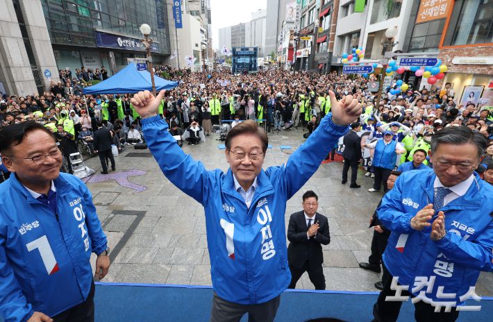 이재명 더불어민주당 대선 후보가 20일 오전 경기 의정부시 태조이성계상 앞에서 열린 유세에 참석해 지지를 호소하고 있다. 의정부=류영주 기자