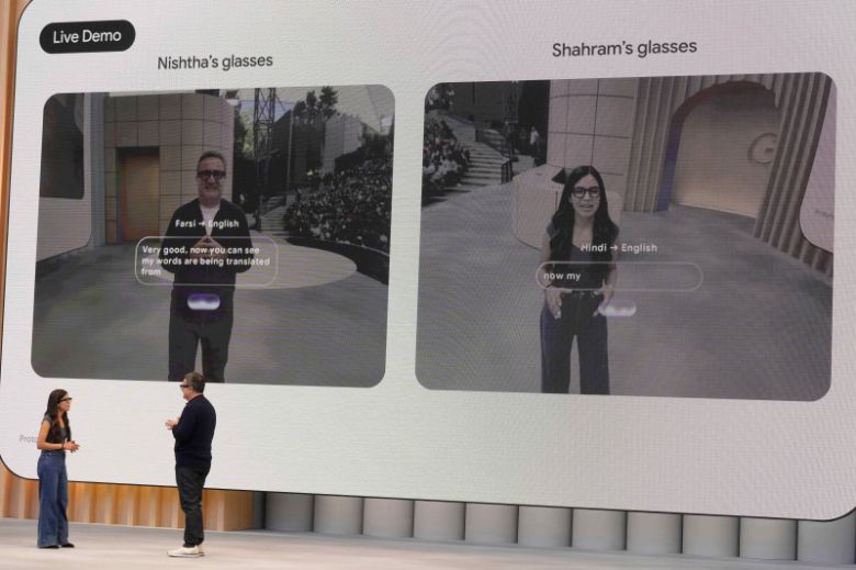 구글이 20일(현지시간) 미국 캘리포니아주 마운틴뷰 본사에서 개최한 연례개발자회의(I/O)에서 샤람 이사디 안드로이드 XR 플랫폼 부사장(VP)과 직원이 스마트 글라스를 착용하고 시연하고 있다. AP연합뉴스 |