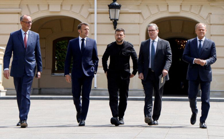 지난 10일 우크라이나 키이우에서 만난 독일, 프랑스, 영국, 폴란드 정상들과 볼로디미르 젤렌스키 우크라이나 대통령. 로이터 연합뉴스 |