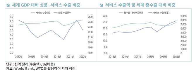 보고서는 먼저 서비스 수출의 성장 가능성에 주목했다. 보고서에 따르면 최근 10년간 세계 서비스 수출의 연평균 증가율은 5.0%를 기록하며 상품 수출의 연평균 증가율(2.3%)을 두 배 이상 상회했다. 경제적 파급 효과 측면에서도 우리 서비스 수출이 전(全) 산업에 유발한 부가가치는 2022년 기준 약 160조 원으로 2015년(86조 원) 대비 약 두 배 가까이 증가했다. 특히, 서비스업 가운데에서도 제조업 가치사슬과 밀접하게 연계된 서비스 분야의 부가가치·생산·취업 유발 효과가 2015년 대비 2022년 103%, 116%, 30%로 큰 폭의 성장세를 보였다. 반면, 같은 기간 기타 서비스 분야는 각각 67%, 69%, 18% 증가하는데 그쳤다.