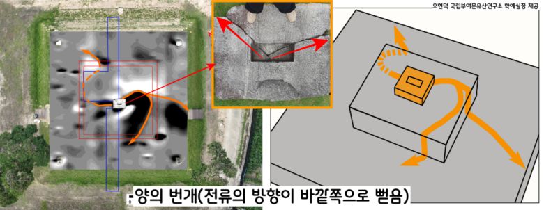 문헌(<관세음응험기>에 639년 벼락을 맞아 소실·붕괴된 것으로 기록된 익산 제석사 목탑터에 대한 자력탐사 결과 실제로 강력한 전류의 흐름이 번개문양으로 측정되었다. 문헌자료가 사실임이 입증된 셈이다.|오현덕 국립부여문화유산연구소 학예연구실장 제공 |