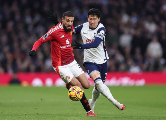 잉글랜드 프리미어리그 토트넘 홋스퍼의 주장 손흥민(오른쪽)이 지난 2월16일(현지시간) 영국 런던 토트넘 홋스퍼 스타디움에서 열린 맨체스터 유나이티드와의 홈경기에서 누사이르 마즈라위와 공을 다투고 있다.   [사진 제공= 연합뉴스]