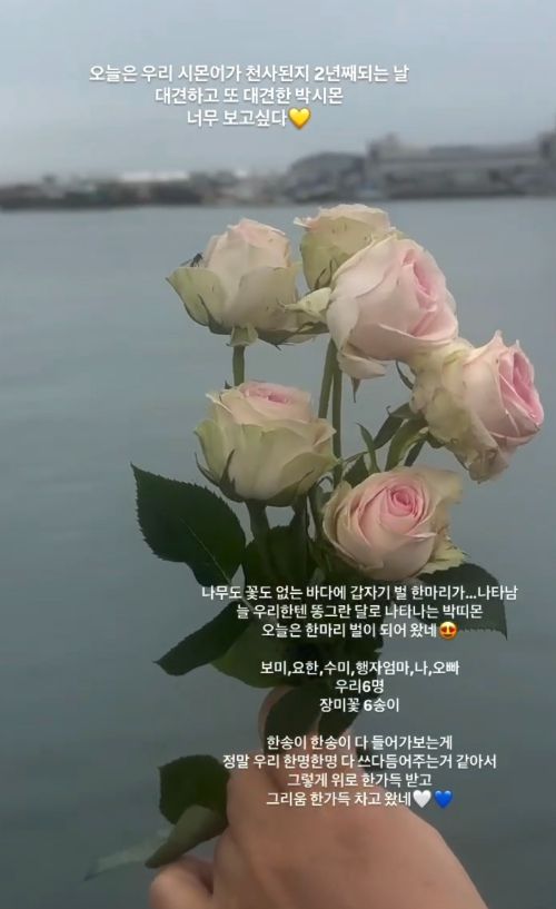 그녀는 “나무도 꽃도 없는 바다에 갑자기 벌 한 마리가… 나타남. 늘 우리한텐 똥그란 달로 나타나는 박띠몬, 오늘은 한 마리 벌이 되어 왔네”라며 아이와의 영적 연결을 상상하며 위로를 전했다. 이어 “보미, 요한, 수미, 행자엄마, 나, 오빠. 우리 6명, 장미꽃 6송이”라고 전하며 주변 지인들과 함께한 추모 현장을 간접적으로 전하기도 했다.