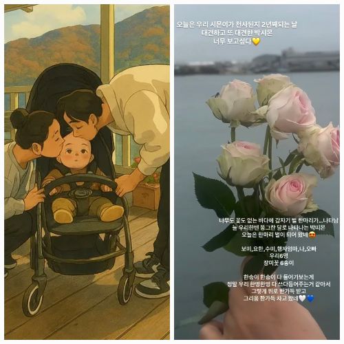 최근 공개된 또 다른 일러스트는 챗GPT 이미지 생성을 통해 제작된 ‘지브리풍’ 그림으로, 유모차에 앉아 있는 아기와 부모의 사랑스러운 순간을 포착한 가상의 한 장면이다. 박보미는 이 그림을 통해 하늘나라에 있을 아들 시몬 군을 가상으로나마 다시 품에 안은 듯한 따스한 감정을 공유했다.