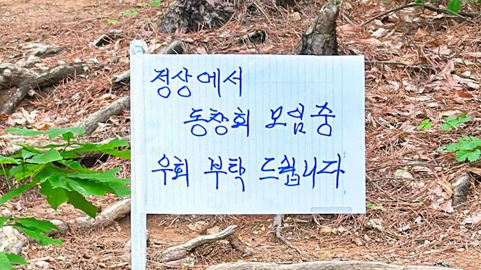 종이로 만든 팻말에 '정상에서 동창회 모임 중. 우회 부탁드립니다'라고 적혀 있습니다.
